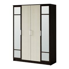 Разместить большой гардероб вы сможете благодаря четырёхстворчетому шкафу Фиеста. Модель выполнена из ЛДСП в комбинации цветов венге и лоредо, две створки являются зеркальными. Внутреннее наполнение состоит из большого центрального отделения со штангой для верхней одежды и вещей на вешалках. Справа и слева от платяной зоны находятся полки. Фасады оснащены эргономичными ручками. Шкаф всегда можно добавить другими модулями из одноименной мебельной серии.